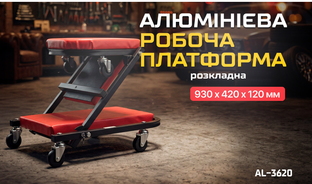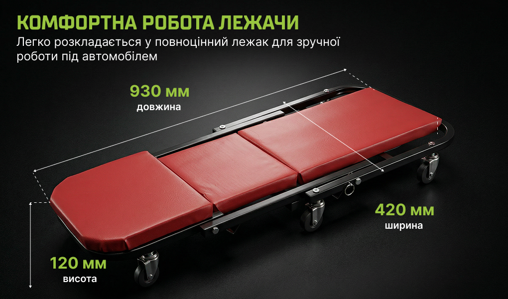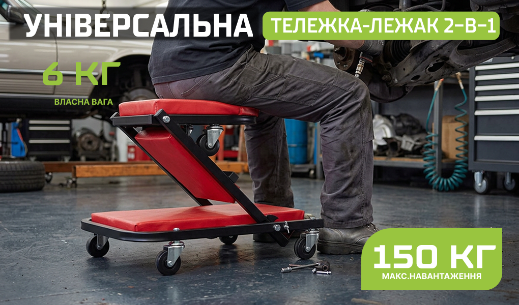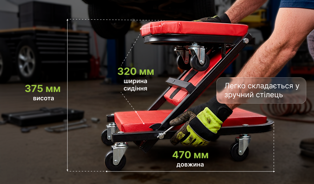 Універсальний візок-трансформер, який легко перетворюється з підкатного лежака у зручний стілець. Ідеальне рішення для механіків, що працюють як під автомобілем, так і біля нього.