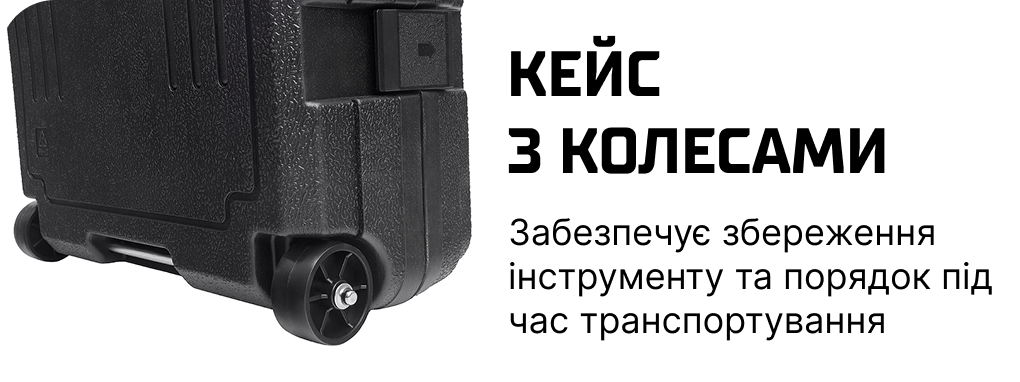 Міцний кейс на колесах— забезпечує зручне зберігання, транспортування та порядок усіх елементів комплекту.
