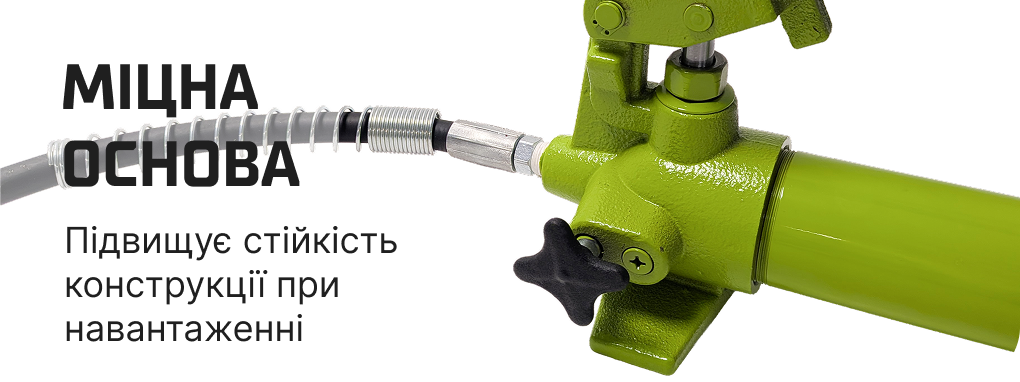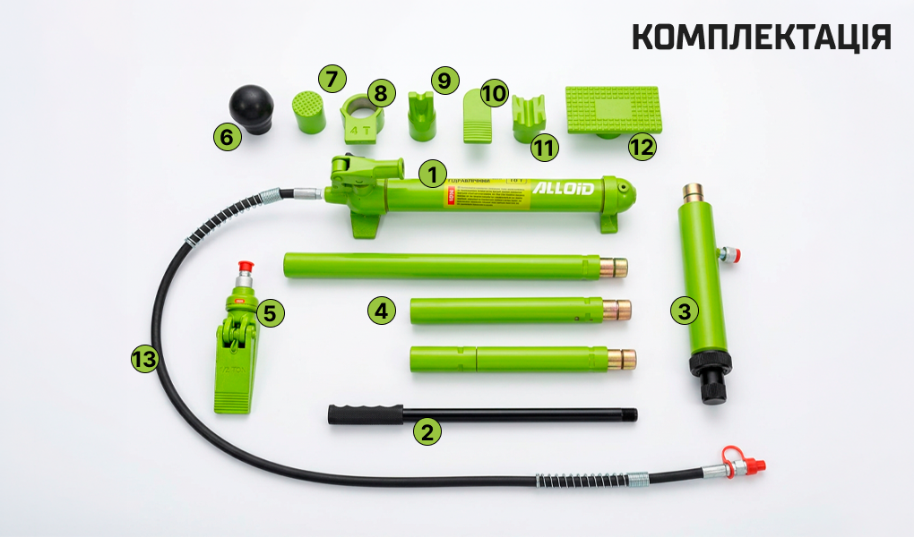 - Комплектація: насос, циліндр, шланг, подовжувачі, розпір, набір насадок і опор