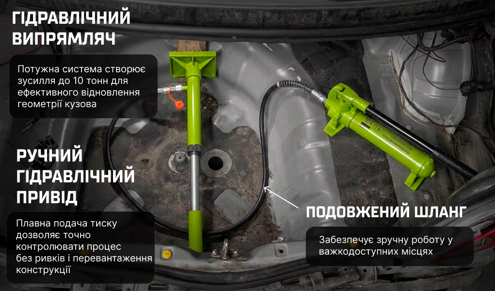 Гідравлічний насос — створює зусилля до 10 тонн для роботи зі складними деформаціями кузова.