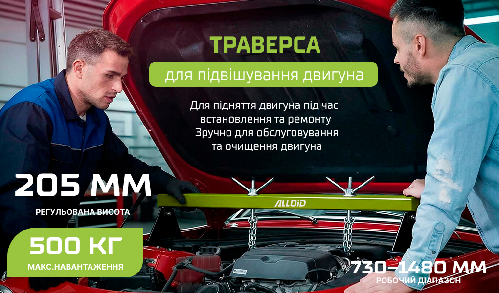 Спеціалізоване обладнання для підтримки та фіксації двигуна в підвішеному стані під час ремонту в підкапотному просторі. Траверса дозволяє безпечно виконувати роботи, пов’язані з від’єднанням силового агрегату від кузова.