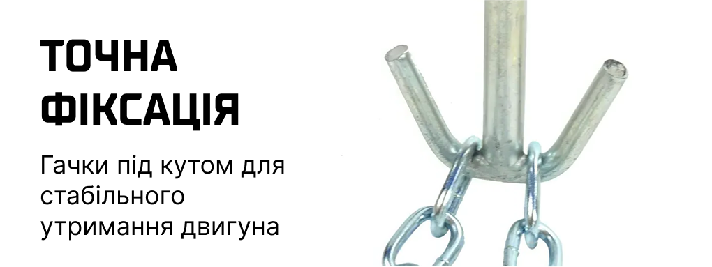 Гачки під кутом забезпечують стабільне утримання двигуна під час рихтувальних і ремонтних робіт. Завдяки продуманій формі вони запобігають зісковзуванню ланцюгів і гарантують надійне зачеплення навіть під навантаженням.