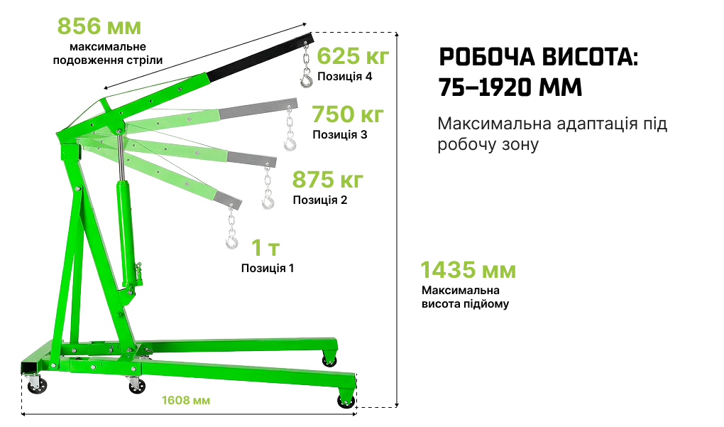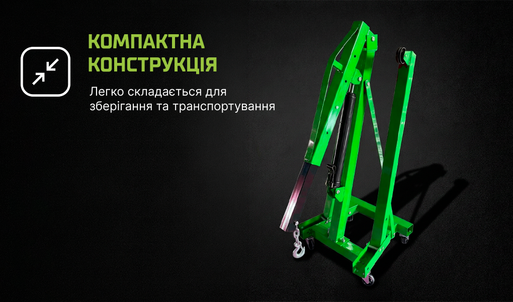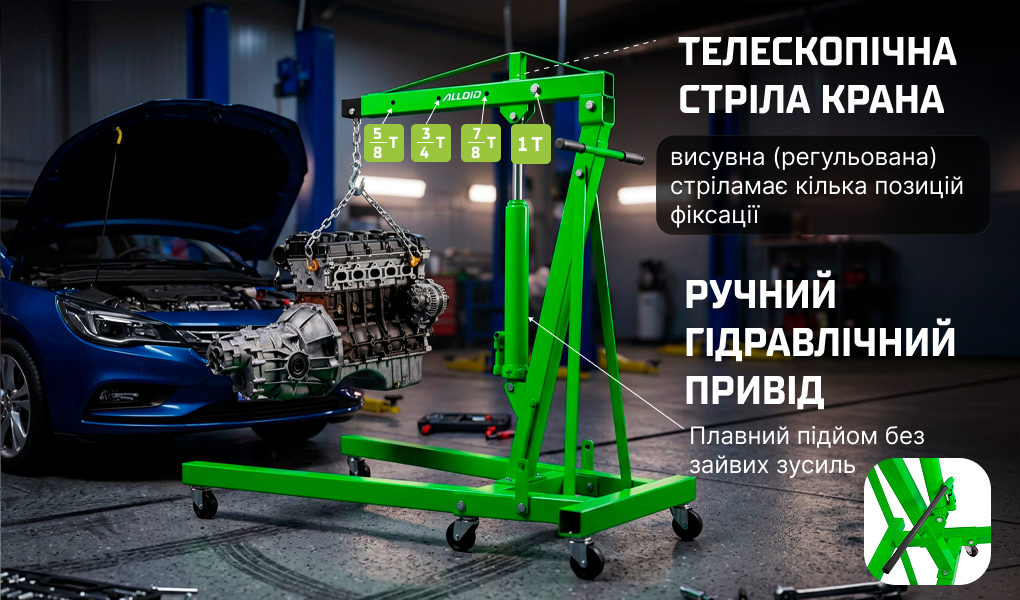 Надійне вантажопідйомне обладнання для монтажу та демонтажу двигунів, коробок передач та інших важких вузлів. Підходить для автосервісів, СТО, гаражів і майстерень, де важливі безпека, маневреність і компактне зберігання.